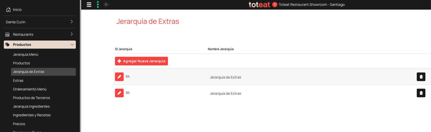 • Nombre → El nombre de la jerarquía de extras (ej.: Bebidas, Acompañamientos).